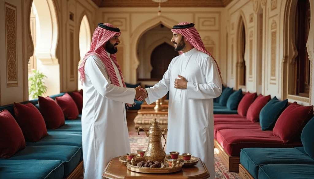 تبدأ لمسات الضيافة فور عبور الضيف عتبة الدار، حيث يتم استقباله بترحيب حار يعكس الأصول البدوية. ومن التقاليد الراقية والمميزة استخدام ماء الورد أو ماء الزهر المعطر، حيث يتم رشه على يدي الضيف أو على رأسه بعد الجلوس مباشرة، وهي لفتة تاريخية ترمز إلى التطهير والترحيب المفعم بالحفاوة. هذا الاستقبال المفعم بالاحترام هو أولى خطوات استقبال بروح الوطن، ويحدد نبرة اللقاء بأكملها.