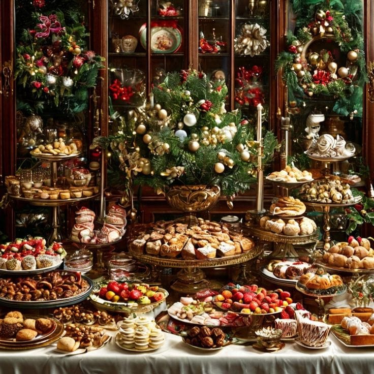 السر الأول الذي يمنح المائدة طابع المعرض الفني هو التخلي عن التنسيق الأفقي الممل. استخدمي حوامل الكعك والمنصات المرتفعة ليس فقط للحلويات، بل لتقديم المقبلات والموالح أيضاً. إن رفع بعض الأطباق عن مستوى الطاولة يخلق تدرجاً بصرياً يجذب العين، ويسمح لكِ باستغلال المساحة بشكل أذكى، مما يمنح المائدة مظهراً احترافياً يحاكي أرقى حفلات الكوكتيل العالمية في ليلة رأس السنة.