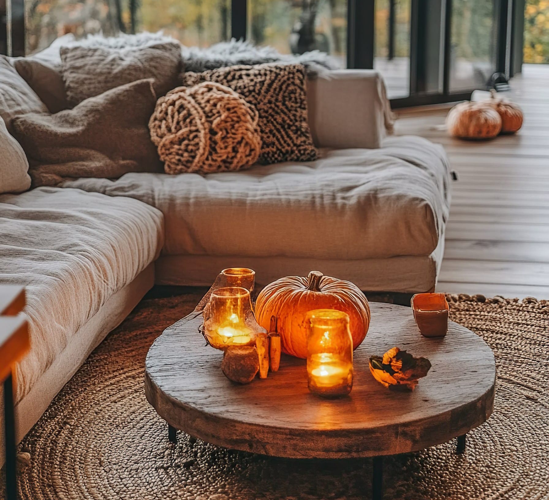لأن الخريف يحمل معه ألوانًا دافئة بطبيعتها، يمكنك الاستفادة من عناصر بسيطة تعزز ذلك: بطانيات محاكة، وسائد بألوان ترابية، فروع بسيطة من الشجر قد تجفّفينها في إناء كزينة مركزية، وشموع معطرة برائحة الخريف (قرفة، قرع، خشب الصندل).