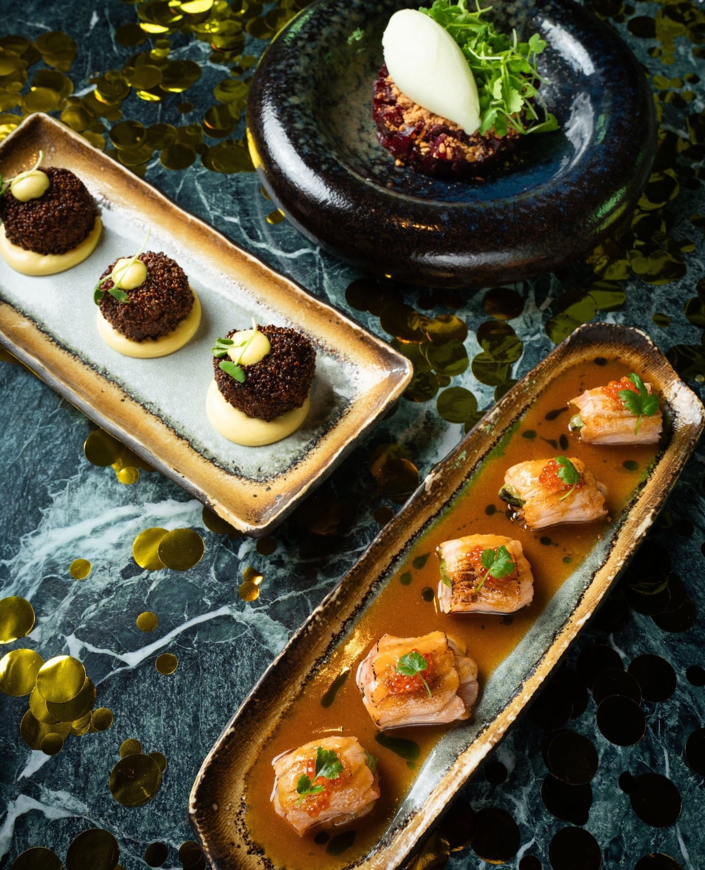 في مأدبة رأس السنة، نبتعد عن التقديم الجماعي الذي يفقد القطع هويتها. الرفاهية تقتضي أن تُعامل كل منشأة صغيرة بخصوصية مطلقة؛ فتوضع فوق ملاعق من الخزف المذهّب، أو تُقدم داخل كؤوس رقيقة تُبرز طبقاتها الملونة كأنها لوحة فنية فاخرة. إن هذا النهج لا يرفع من سويّة المائدة فحسب، بل يمنح الضيف شعوراً بالتبجيل، حيث يدرك أن كل قطعة قد نُحتت خصيصاً لتكون جزءاً من تجربته الشخصية.