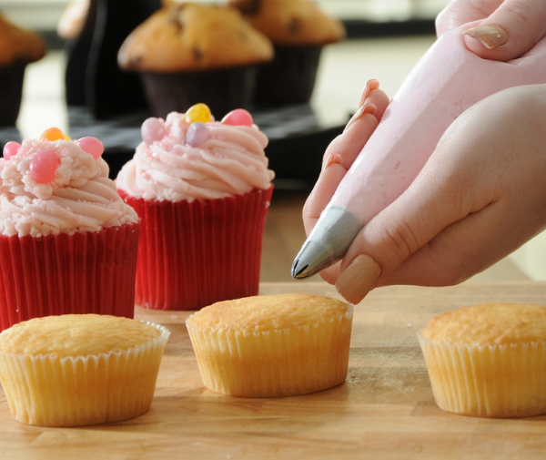 بعد اكتمال الخَبز، تبدأ مرحلة التزيين التي تمنح الحلوى شخصيتها الخاصة. هنا يظهر دور كيس التزيين، الذي يسمح برسم خطوط دقيقة من الكريمة أو الشوكولاتة فوق السطح.