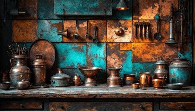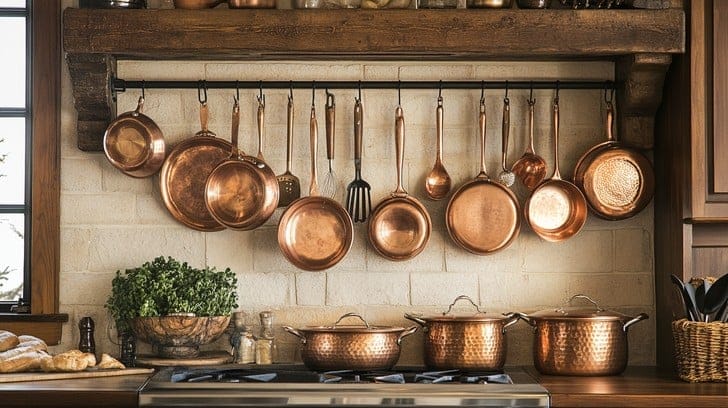 الألوان النحاسية والبرونزية تتناغم بشكل طبيعي مع لوحات الخريف: البرتقالي الداكن، البني الدافئ، والأحمر الخفيف. هذا التناغم يمنح المطبخ دفئًا بصريًا ويعيد إليه شعورًا بالتراث والعمق. مع الوقت، تتشكّل على سطح المعدن طبقة طبيعية تُعرف بالباتينا، تضيف لمسة عتيقة أنيقة وتُبرز شخصية الأداة. وهكذا تتحوّل أواني النحاس والبرونز من أدوات وظيفية إلى قطع فنية تعزز جمال المطبخ، سواء كان بتصميم عصري أو ريفي.