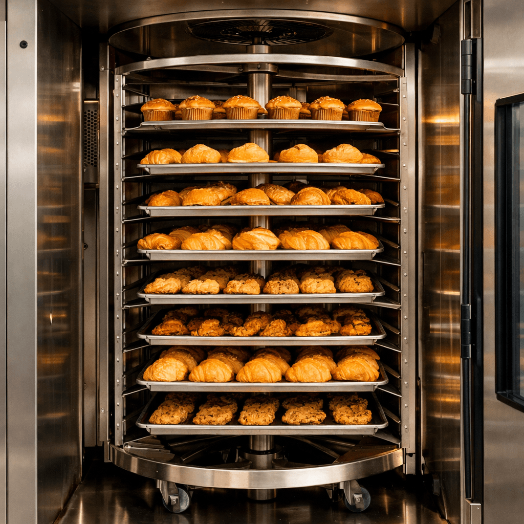 الفرن الدوّار يُعد من أكثر الأجهزة ملاءمة لخبز كميات كبيرة من الحلويات، خصوصًا خلال فترات الضغط المرتفعة التي يفرضها موسم الأعياد. آلية الدوران الداخلي تسمح بتوزيع الحرارة بشكل متوازن حول الصواني، ما يقلّل من الفروقات بين قطعة وأخرى ويمنح نتائج متقاربة في اللون والقوام والنضج. هذا النوع من الأفران مناسب للكيك الإسفنجي، كعكات الفواكه، لفائف البسكويت، وكل وصفة تحتاج إلى حرارة مستقرة لفترة زمنية أطول.