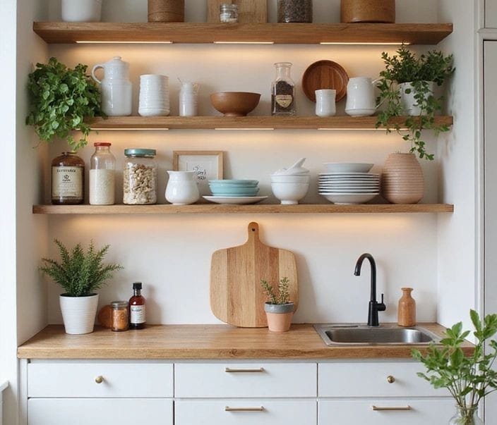 هذا الأسلوب لا يُوفّر مساحة فحسب، بل يُضفي طابعًا عمليًا وجماليًا على المطبخ، خاصة إذا تم ترتيب الأدوات حسب الحجم أو الاستخدام.