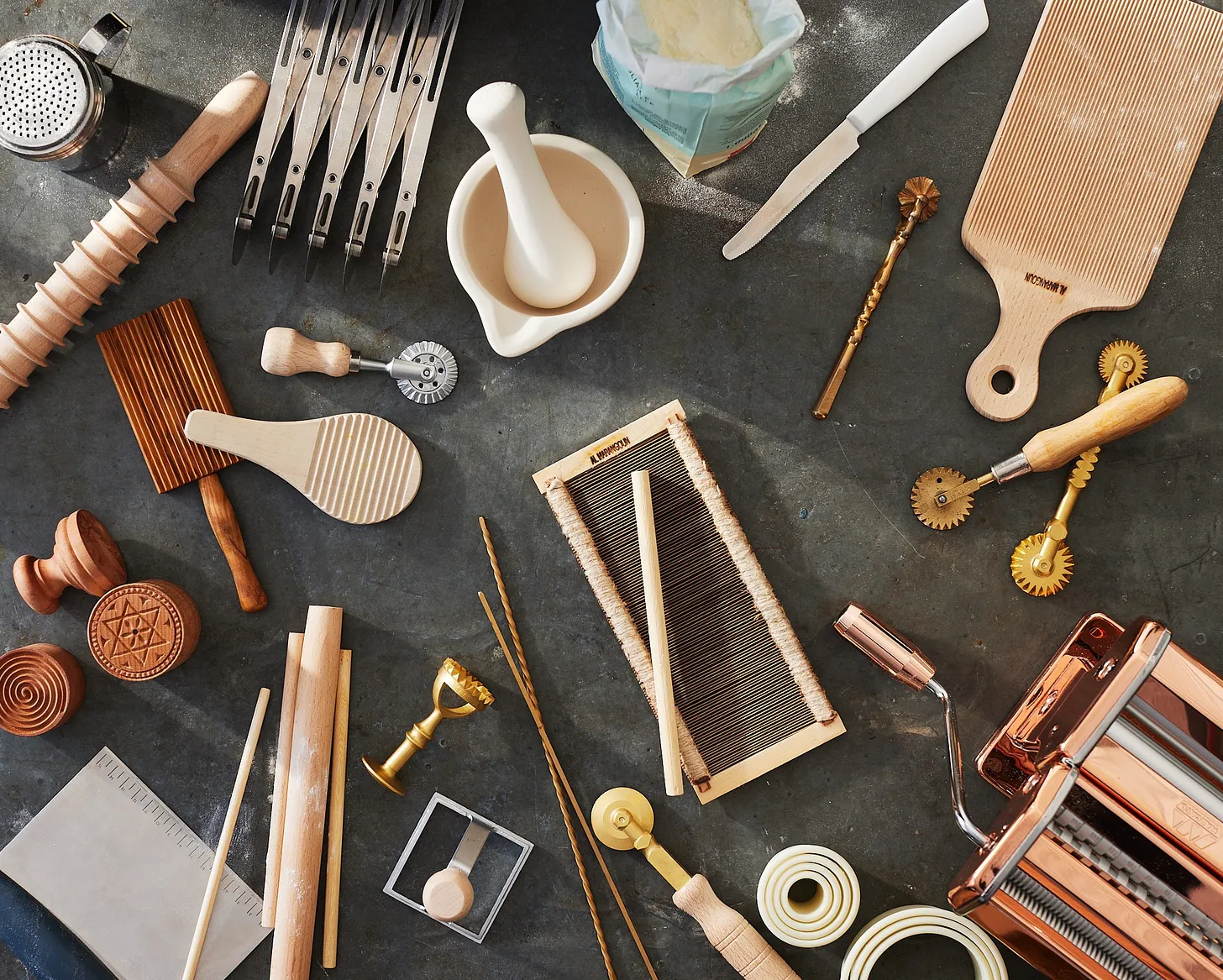 تعد الخامات الخشبية، وخاصة خشب الزان أو الجوز، الخيار المفضل لتشكيل الباستا نظراً لقدرتها الطبيعية على امتصاص الرطوبة الزائدة من العجين، مما يمنح الباستا سطحاً خشناً قليلاً يساعد على التصاق الصلصة بها بشكل أفضل. في المقابل، تبرز الأدوات المعدنية المصنوعة من الفولاذ المقاوم للصدأ في عمليات التقطيع الدقيق والبيتزا، حيث تضمن الحواف الحادة قطعاً نظيفاً دون تمزيق ألياف العجين. إن الجمع بين دفء الخشب في التشكيل ودقة المعدن في التقطيع يمثل التوازن المثالي في مطبخ أي باحث عن الجودة، حيث لكل مادة وظيفة تقنية تعزز من قوام العجين وشكله النهائي.