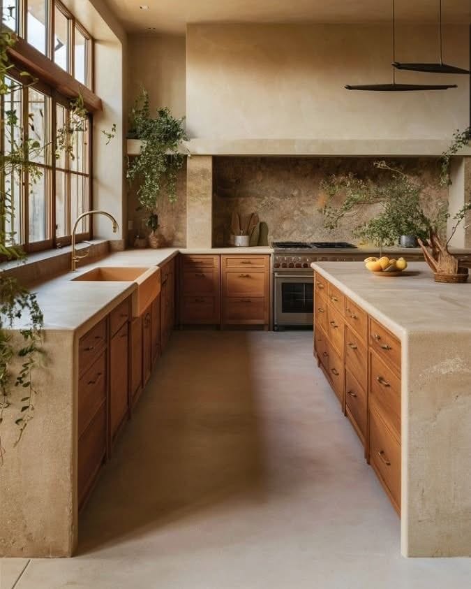 تتجلى عبقرية هندسة المواد الطبيعية في استخدام الحجر الجيري والصلصال في تكسية الجدران أو “الباك سبلاش”. توفر هذه المواد ملمسًا غير مصقول يمنح المطبخ طابعًا ريفيًا عصريًا (Rustic Modern)، وتساعد المسامية الطبيعية لهذه المواد في امتصاص الضوضاء وتحسين البيئة الصوتية داخل المكان. تمنح التدرجات اللونية الهادئة للحجر إحساسًا بالسكينة، وتجعل من عملية الطهي تجربة بصرية ممتعة وسط عناصر مستوحاة من البيئة البكر.
