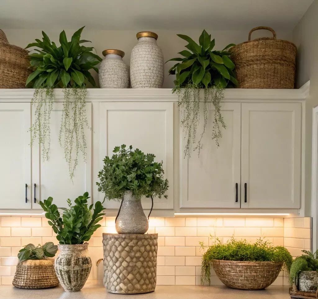 إنّ إضافة النباتات التي تتحمّل أجواء المطبخ، مثل الصباريات أو النباتات الهوائية، تمنح المساحة فوق خزائن المطبخ حياةً وجمالًا. احرصي على اختيار أوعية أنيقة لضمان تناسق التصميم.