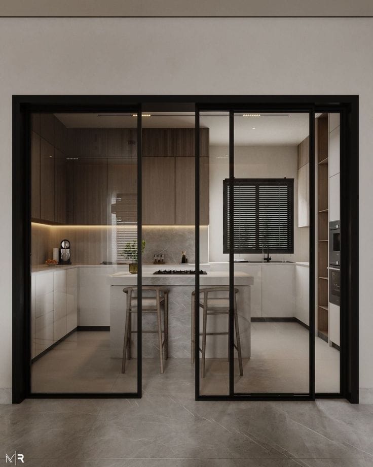 تُوفر الأبواب الانزلاقية المخفية حلولًا ذكية للمساحات الضيقة والواسعة على حد سواء. يلغي هذا النظام الحاجة إلى مساحة دوران الأبواب التقليدية التي قد تعيق الممرات داخل المطبخ. يسمح التصميم بفتح الخزائن بالكامل من دون ازدحام، مما يمنح سعة أكبر للتحرك بحرية بين منصات التحضير. تبرز أهمية هذه الأبواب في الشقق العصرية التي تعتمد نظام “المخطط المفتوح”، حيث يختفي المطبخ بلمسة واحدة ليصبح جزءًا من ديكور الصالة الراقي.