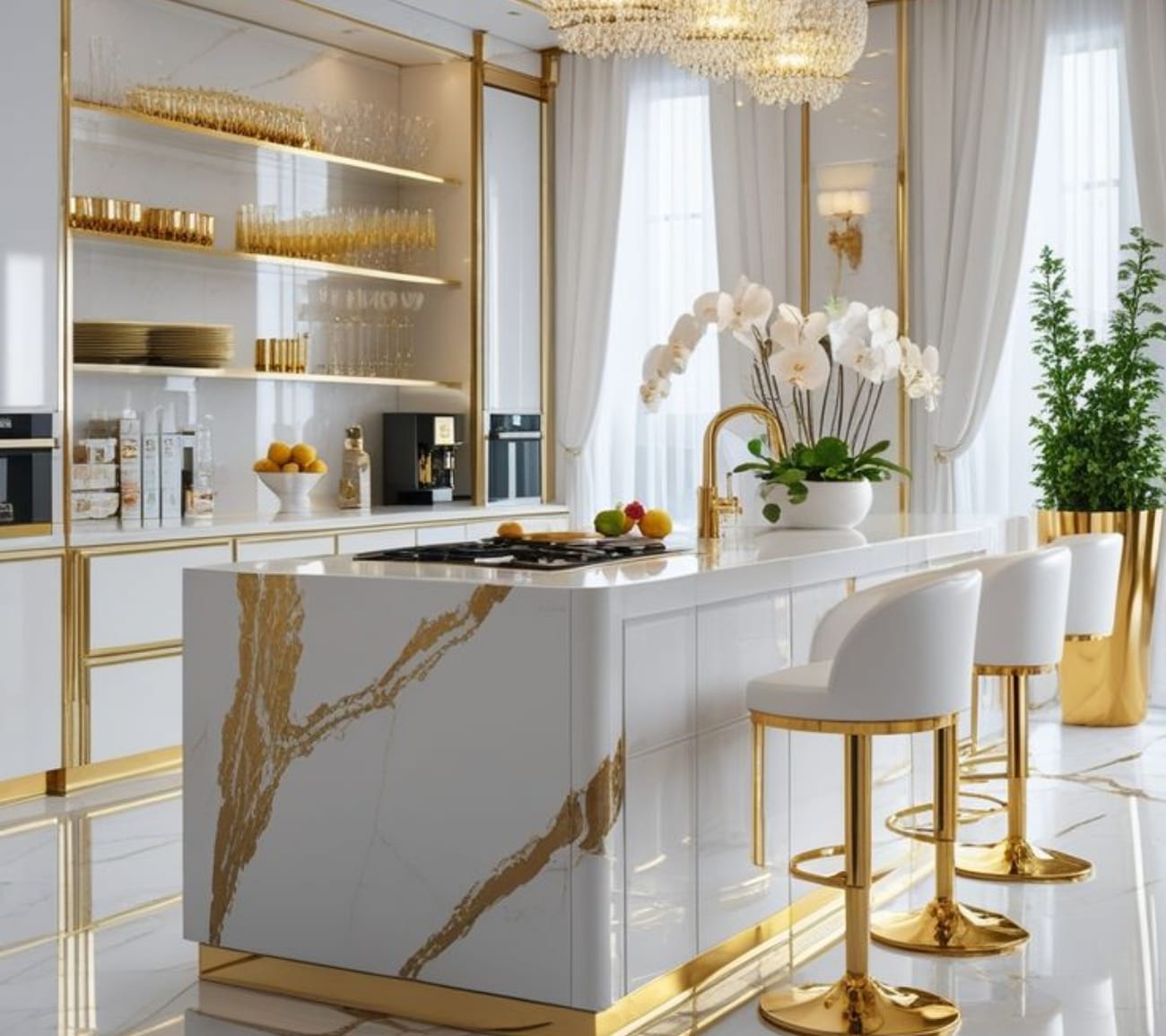 يُعزّز تصميم مطبخ ذهبي الإحساس بالفخامة من خلال اللمسات النهائية كالحنفيات المطلية بالذهب، أو الإضاءة الخافتة المنعكسة على الأسطح اللامعة. وعندما تُضاف تفاصيل بسيطة كأدراج ذات مقابض ذهبية أو كراسي بقاعدة معدنية ذهبية، تتحوّل المساحة اليومية إلى لوحة فنية تنبض بالحياة والذوق.