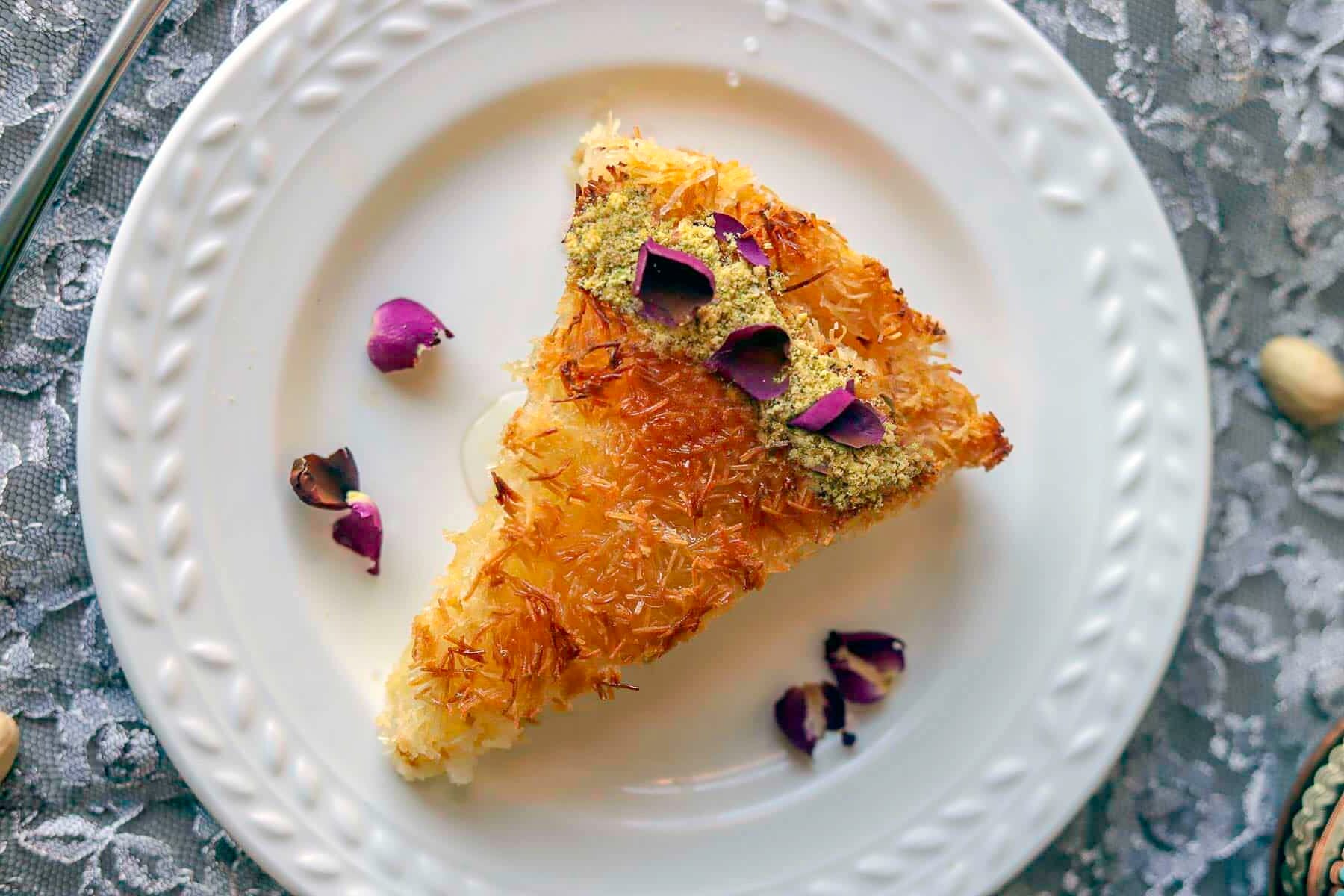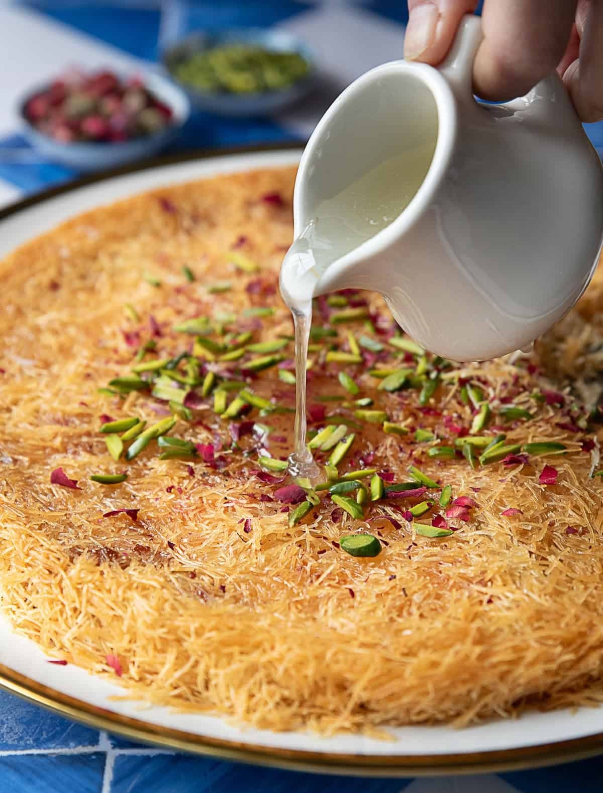 جودة شعر الكنافة وتقنية دهنه هما مفتاح اللون الذهبي والقوام المقرمش الذي يحيط بالقشطة.