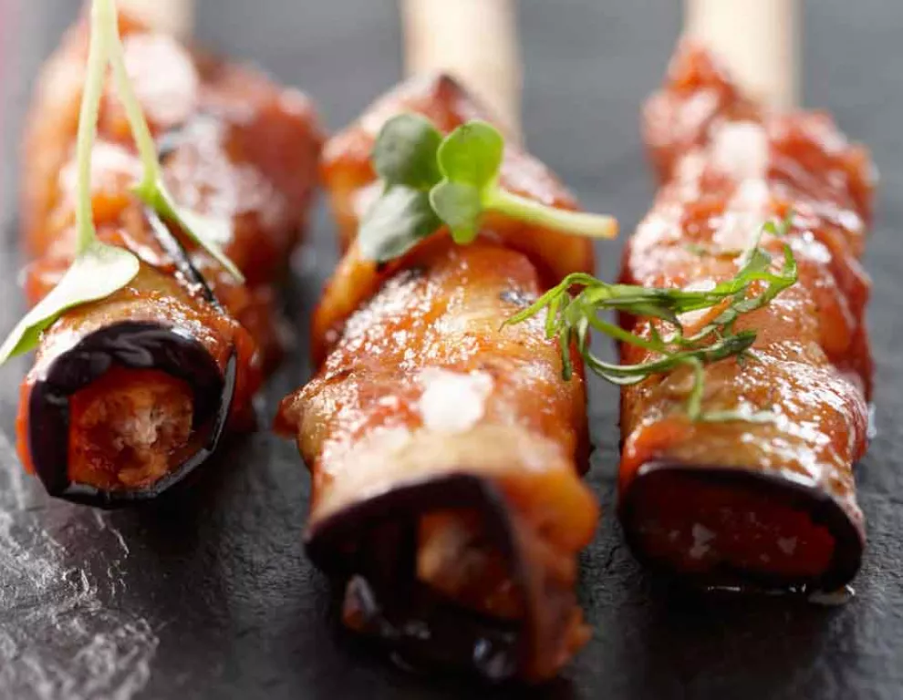 عندما تستقبل ضيوفًا في منزلك، جرب تجميع طبقٍ من المقبلات أو حتى طاولةٍ كاملةٍ إذا كان العدد كبيرًا. يسمح هذا الطبق للمُضيفين بتجربة ما يرغبون به، وكمية ما يرغبون بها. ستكون هذه لفائف الباذنجان إضافةً مثاليةً إلى طبق المقبلات، فهي مليئة بالنكهات، ويمكن تجميعها وخبزها مسبقًا، وهي خيار ممتاز للنباتيين.