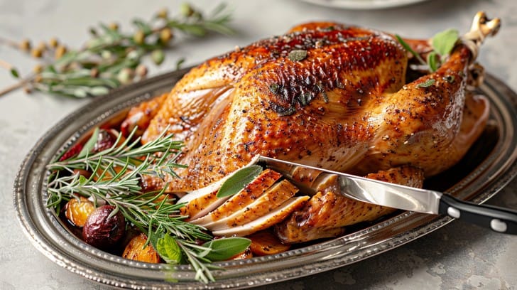 - عند النضج، يُترك الديك ليرتاح لمدة 15–20 دقيقة قبل التقطيع، لتثبيت العصارة داخل اللحم.