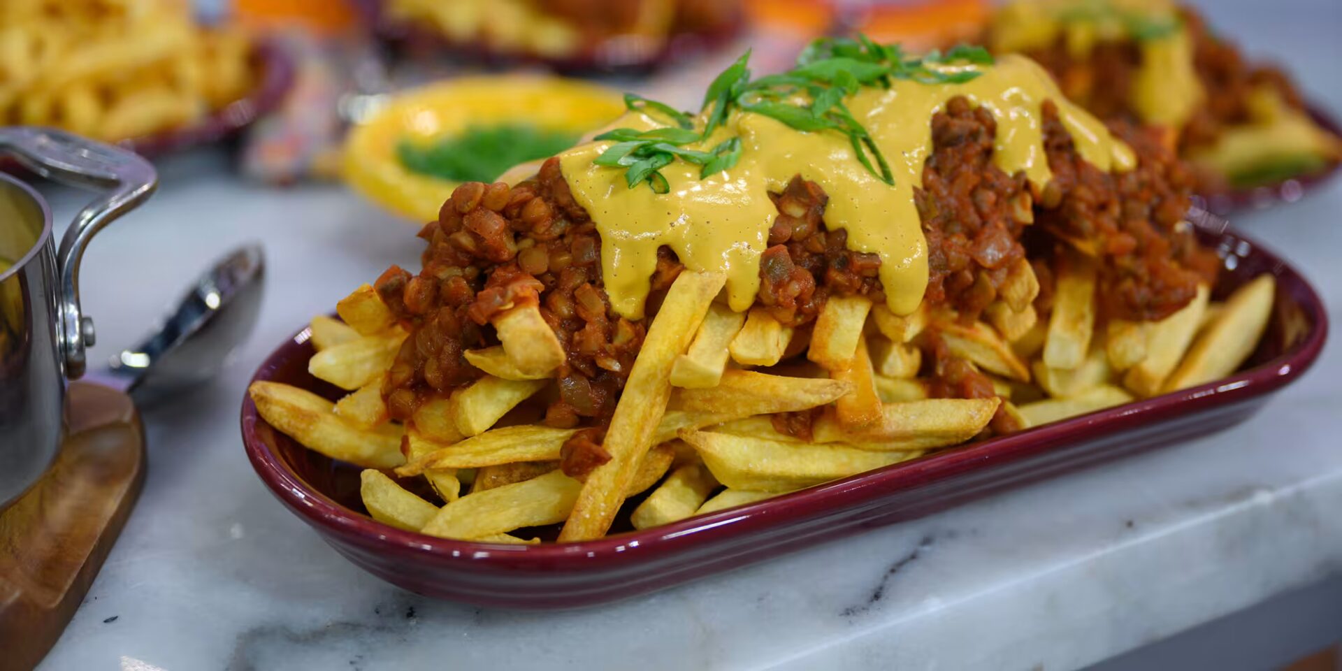 - في طبق التقديم، تُوضع طبقة وفيرة من البطاطس المقرمشة، ثم يُسكب فوقها مزيج اللحم الساخن بانتظام.