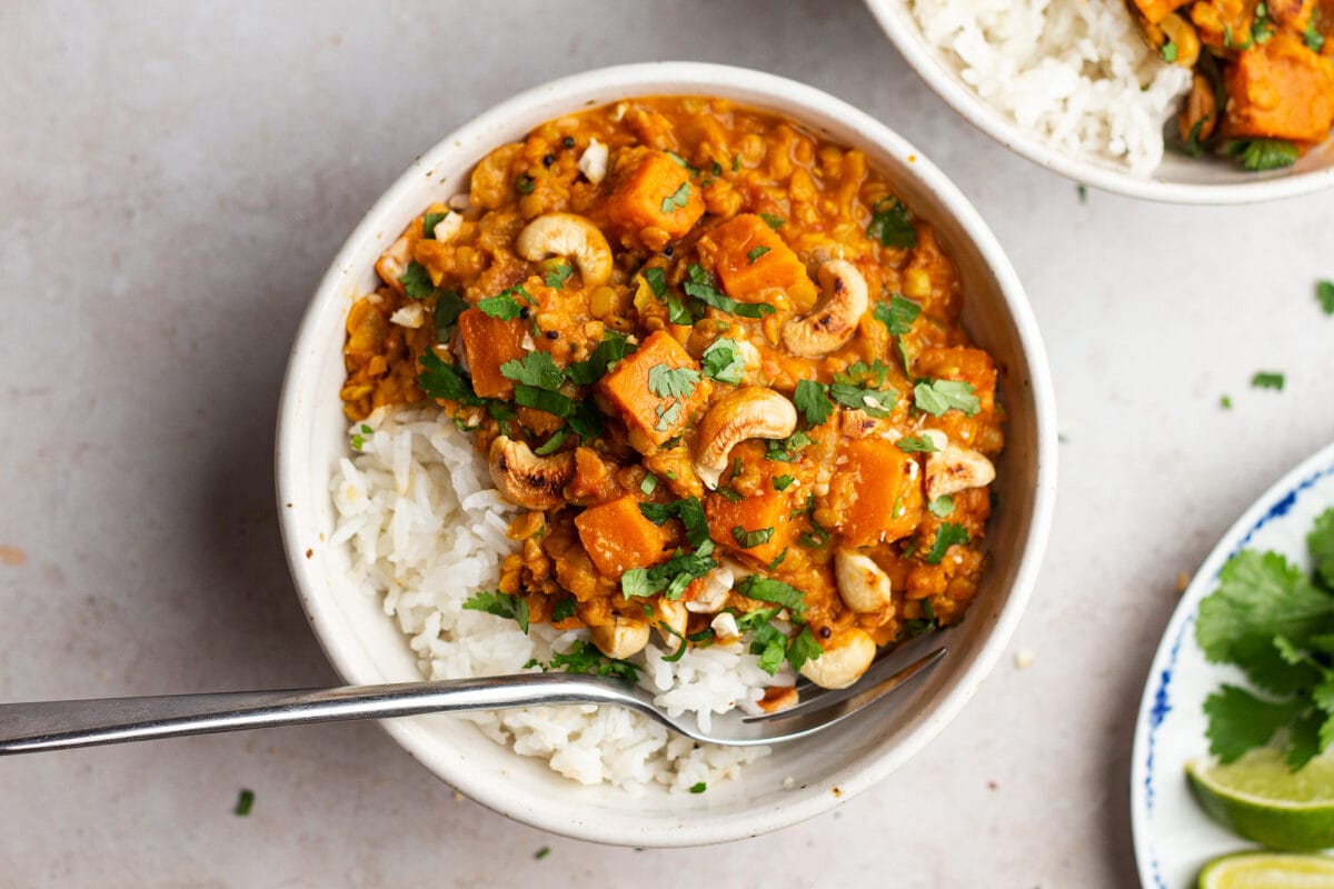 تعانق وصفة البطاطا الحلوة مع العدس الأحمر والكاري أجواء الخريف. يمزج هذا الكاري بين حلاوة البطاطا، وقوام العدس الأحمر، والتوابل الدافئة ليمنحك طبقًا مُرضيًا وصحيًا في آن واحد. وصفة سهلة التحضير، مثالية لأيام البرودة، ويمكن تقديمها مع الأرز أو الخبز.
