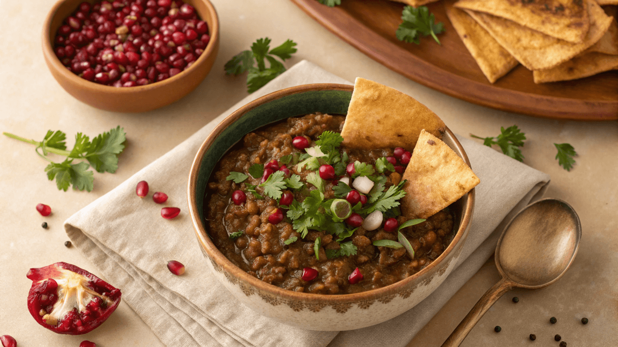 6. يُزين الوجه بطبقات من الخبز المقلي، البصل المحمر، والرمان الطازج، ويُقدم دافئاً أو بارداً حسب الرغبة.