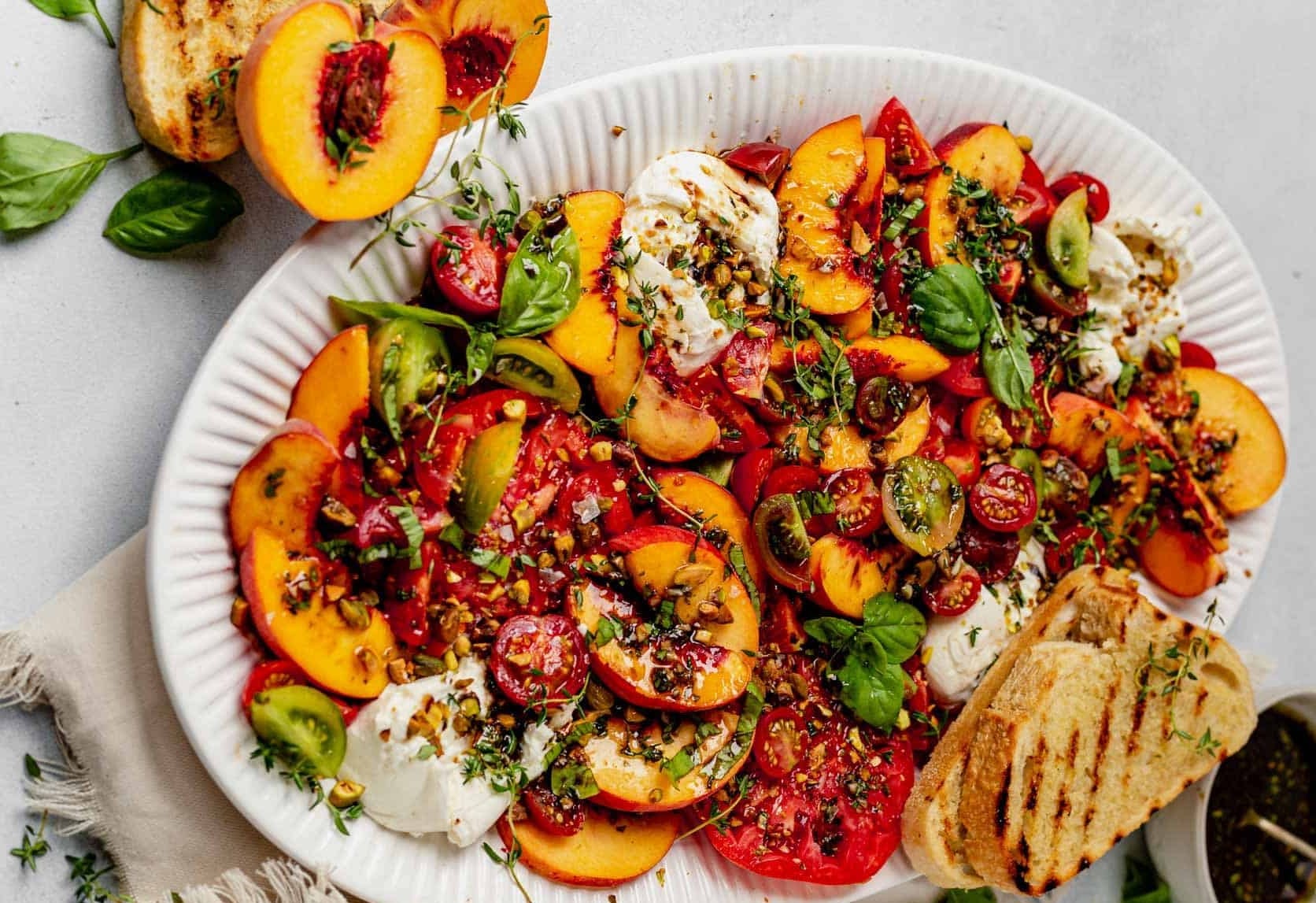 - رتّب شرائح الطماطم والخوخ في طبق تقديم واسع بشكل متناسق.