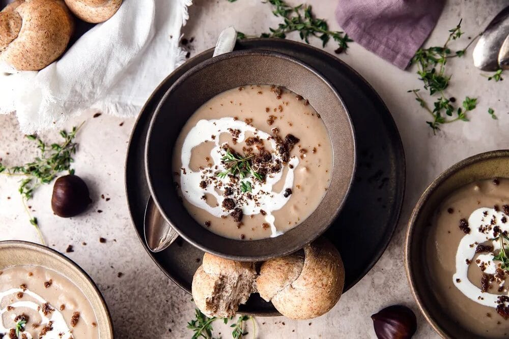 تعتبر شوربة الكستناء الكريمية أيقونة الأناقة على مائدة الشتاء، فهي ليست مجرد طبق لبدء الوجبة، بل هي احتفاء دافئ بخيرات الطبيعة في أبهى صورها. تمتاز هذه الشوربة بقوامها الحريري ونكهتها الفريدة التي تمزج بين الحلاوة الطبيعية الخفيفة للكستناء وبين عمق المرق الغني، مما يخلق سيمفونية من المذاق الذي يداعب الحواس ويمنح الروح شعوراً فورياً بالسكينة. إنها الخيار الأمثل لمن يبحث عن الفخامة والبساطة في آن واحد، حيث تحول كل ملعقة منها أمسيتكِ الباردة إلى تجربة فندقية راقية تضج بالدفء والرفاهية.