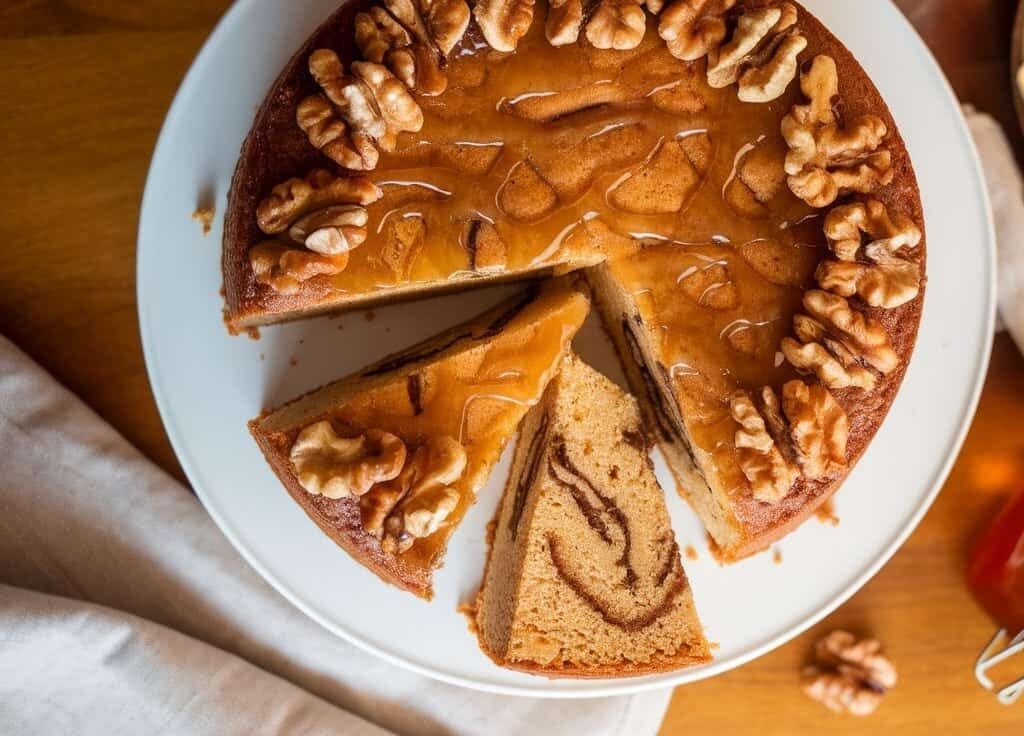 - بعد أن تبرد الكعكة قليلاً، اسكبي الكراميل فوق السطح، زيني بالمزيد من الجوز إن أردت، وقدّميها دافئة للحصول على طعم أعمق.