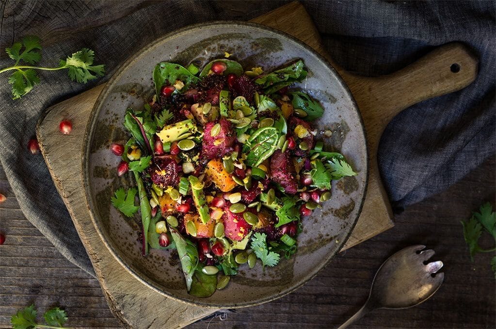هذه السلطة تتكون من كينوا مطبوخة مع خيار، وبندورة، وفليفلة ملونة، وبصل أحمر. يمكنك تتبيلها بزيت زيتون وعصير ليمون للحصول على نكهة منعشة. هذه السلطة تعتبر وجبة خفيفة ومغذية، مع سعرات حرارية قليلة نسبياً.